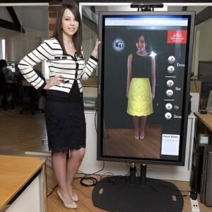 Approach & Activate: The guest approaches the mirror and taps the touch screen to start.